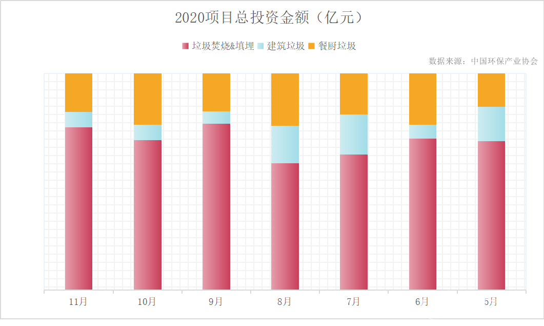 2020年前11个月,全国垃圾焚烧中标项目共计311项,总投资金额共计655.15亿元;餐厨垃圾处理处置中标项目共计361项,总投资金额194.6亿元;2020年5月到11月,全国建筑垃圾处理处置中标项目共计213项,总投资金额61.85亿元。