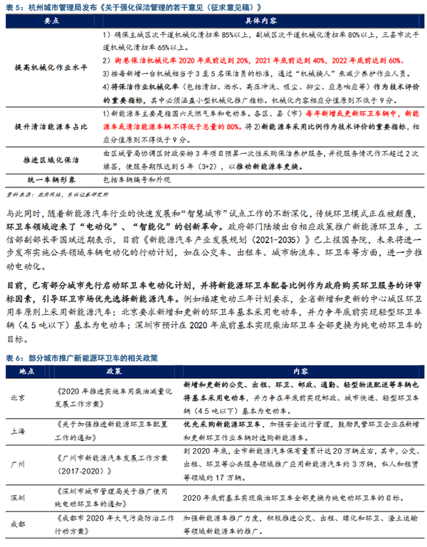 环卫服务:随着环卫服务市场对“电动化”、“智能化”装备应用的重视,各地在招投标时将向具有装备提供能力的环卫服务企业倾斜,行业准入门槛提升,龙头企业的品牌力、口碑力显现,装备+服务一体化的龙头企业将迎来装备+服务的双重催化。