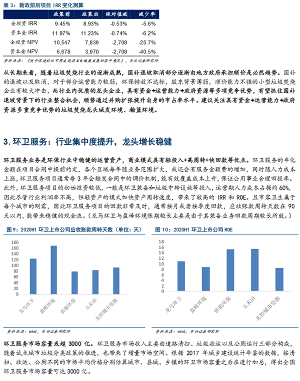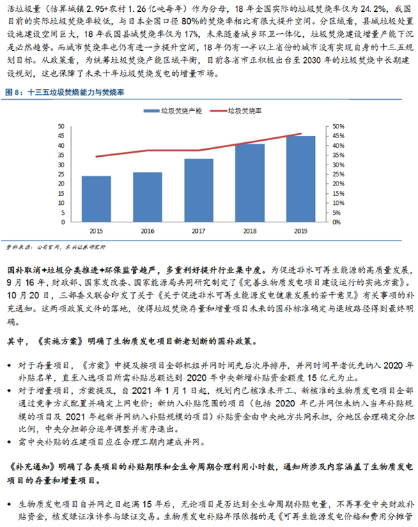 垃圾焚烧:随着垃圾焚烧行业的逐渐成熟,国补退坡取消部分逐渐由地方政府承担顺价是必然趋势。国补的退坡以及取消,对于部分运营能力较弱,环保排放不达标,股东背景薄弱,顺价能力不强的小型垃圾焚烧发电企业有较大冲击,而行业内优质的龙头企业,具有资金+运营能力+政府资源等多项竞争优势,有望抓住国补退坡背景下的行业整合机会,顺势通过并购扩张提升自身的市占率水平。